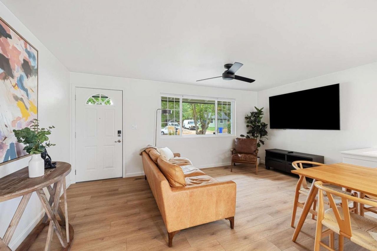 Completely remodeled in 2022 - interior and exterior paint, carpet, laminate flooring, custom tiled shower, new toilets, faucets, quartz countertops, washer dryer, windows, window coverings, central AC, new plumbing, new electrical service for EV (electric vehicle) charging capability, newer lighting, seamless rain gutters, sprinkler system, concrete edging, fenced back yard with 8 dog run, fully insulated garage door with belt drive opener. Additional amenities: 6 person hot tub, purchased locally from Mountain Hot Tubs, large outdoor Sauna, 2 mounted large screen Samsung TVs and an outdoor shower.